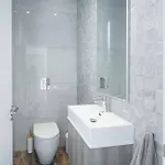 Zur Ausstattung des Badezimmers gehören auch eine getrennte Toilette und eine Dusche. Badelaken sorgen für zusätzlichen Komfort.